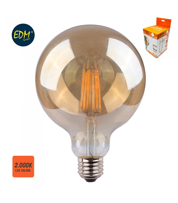 Potencia 8 W Color luz blanco cálido LED nº 4 tipo espiral Temperatura color 2200 K Flujo luminoso 140 lm Dimensiones A 170 mm B Ø125 mm Vida útil 20.000 h Línea globo G125 Factor de potencia 0'5 Índice de reproducción cromática 80 Acabado base dorado Color cristal dorado Ángulo haz 360º