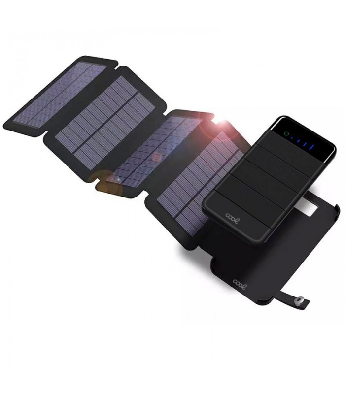 Batería Externa 10.000 mAh COOL + 4 Paneles Solares Batería universal portátil recargable de 10.000 mAh ideal para cargar tu smartphone, con 4 paneles solares. Diseño moderno y cuidado, compacta y fácil de llevar en cualquier bolsillo o compartimento. Peso ligero. Fabricado con los mejores estándares de calidad, para prolongar la batería de su dispositivo, en aquellos momentos que es más necesario estar conectado. Incorpora 4 paneles solares plegables, los cuales se autorecargan, tanto con luz solar, como con luz artificial. Incorporan en la pantalla frontal, un led verde indicador de si está recibiendo carga a través de los paneles.