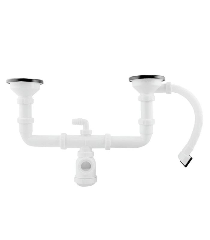Sifón desagüe doble en PVC de alta calidad. Rosca lateral de 1 1/2"" para tubo de 40 mm. Incorpora conexión para lavadora o lavavajillas. Ajustable en altura para facilitar el acoplamiento. Sifón con rebosadero y doble válvula de cesto.